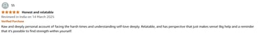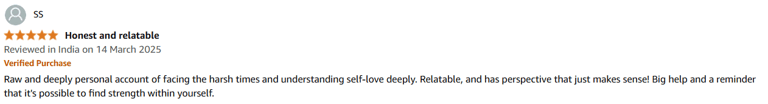 "Raw and deeply personal account of facing the harsh times and understanding self-love deeply. Relatable, and has perspective that just makes sense!"